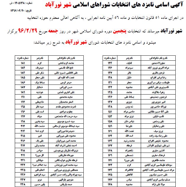 اسامی نهایی نامزدهای انتخابات پنجمین دوره شوراهای اسلامی شهر نورآباد به همراه کد کاندیداها منتشر شد.