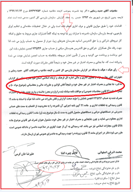 ۱ . در مقدمه حکم مذکور اشاره شده که رسایی مبلغ ۳/۹۲۷/۱۴۶/۶۱۵ ریال از حساب انجمن نمایش را در امور تملک دارایی اداره ارشاد مصرف کرده و همه مبالغ به حساب بازگردانده شده است به جز ۳۲۰/۸۸۵/۳۳۵ ریال که این مبلغ ۳۲ میلیون تومان نیز جهت پرداخت حقوق نیروهای شرکتی، اضافه کار کارمندان، خرید خودروی سمند برای انجمن نمایش و مبلغی جهت پرداخت باقی مانده زمین مجتمع هنری مصرف شده است. یقینا اگر هیأت مذکور تن به قانون می داد و مواردی را که تخلف برشمرده به بنده اعلام می کرد، مستندات کامل به آنها ارائه می شد. اما از آنجا که هیأت مذکور بنای کشف حقیقت را نداشته و بیشتر اغراض سیاسی بر تصمیم آن حاکم بوده، به درخواست بنده پاسخی داده نشد و رأی خود را ابتدا مخفیانه و بدون ابلاغ به بنده و سپس در رسانه های عمومی صادر کرد.