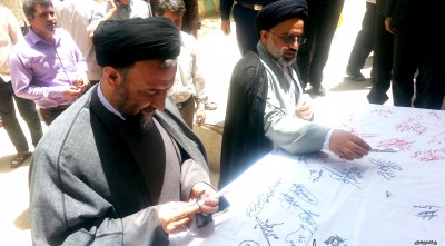 حجت الاسلام حسینی امام جمعه اسبق دلفان و حجت الاسلام هاشمی نژاد امام جمعه فعلی دلفان در حال امضاء نمودن طومار در محکومیت زیاده خواهی غرب در مذاکرات هستند.