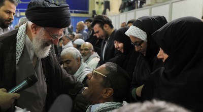 همسر جانباز میگوید: ما وقتی شادی و بشاشیت رو توی چهره شما میبینیم حالمون خوب میشه. بعد هم ادامه میدهد: الان ما میگیم اعوذ بالله من الشیطان الرجیم و اعوذ بالله من الآمریکا! آقا میگویند: شیطان عظیم! باز همه میخندند.